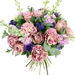 Bathed in soft, even light, this vibrant bouquet celebrates Byfleet's classic floral style with a palette rich in indigo, lavender, and creamy white. Majestic hydrangeas, their clustered petals in shades of deep blue and teal, form a luxurious base, conjuring visions of morning skies over Byfleet's peaceful parks. Between these textured blooms, delicate lilac roses blossom in gentle gradients, imparting a romantic, timeless spirit. Creamy white roses and layers of plush ranunculus bring further depth and invitation. Scattered sprigs of yellow lisianthus buds and blossoms offer moments of brightness, their gentle presence hinting at the start of spring along Byfleet's village lanes. Streams of fuchsia-pink mini-flowers and airy pale pink astilbe float through the bouquet, lending playful movement and soft colour transitions. Dainty green and white filler blooms evoke the lacy texture of wildflowers in Byfleet meadows, while deep green leaves lend structure and freshness. Meticulously gathered and finished with a lustrous royal purple satin ribbon, the bouquet blends sophistication with a warm sense of home. Perfect for celebrating birthdays, anniversaries, or marking a heartfelt occasion in Byfleet, this arrangement embodies the approachable expertise and attentive care characteristic of local florists.